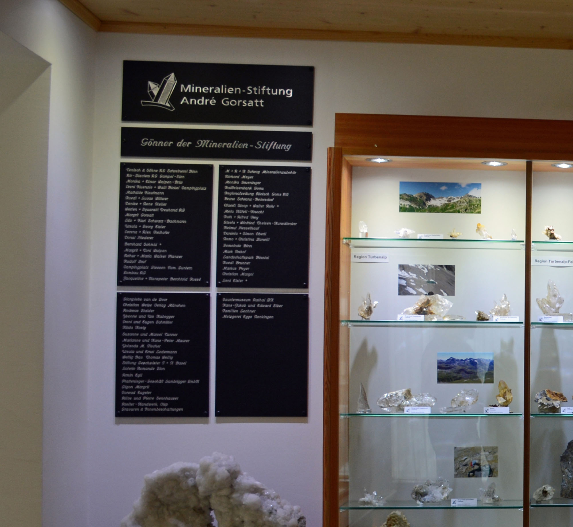 Alle Spenden und Gönnerbeiträge kommen ausschliesslich und vollumfänglich der Mineralien Stiftung André Gorsatt in Fäld 25 / CH-3996 Binn zugute.